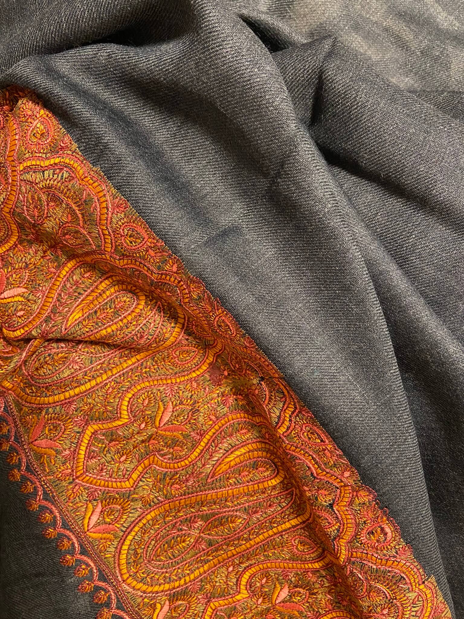 BLACK shawl with red/orange embroidery in paisley design.Β